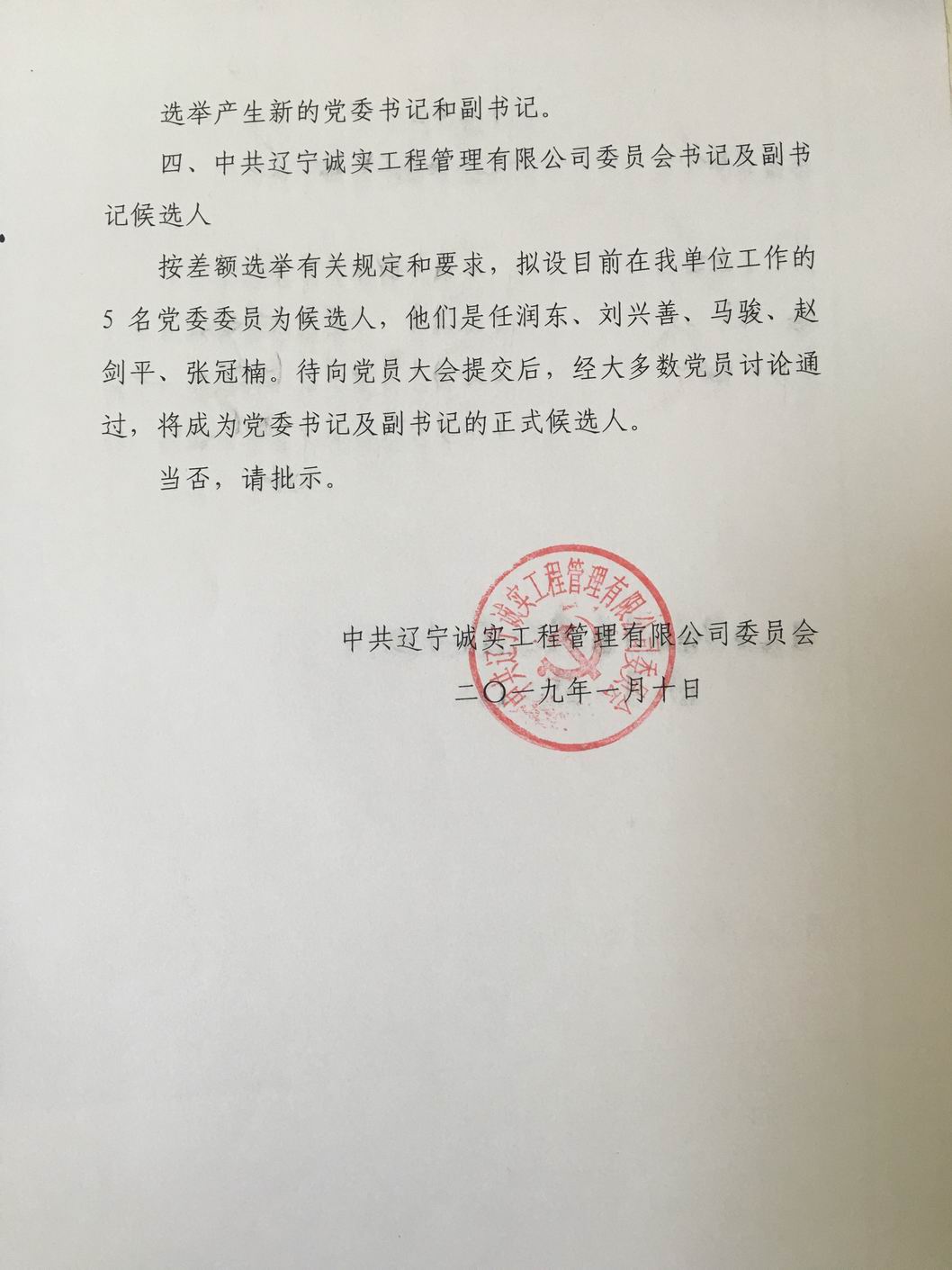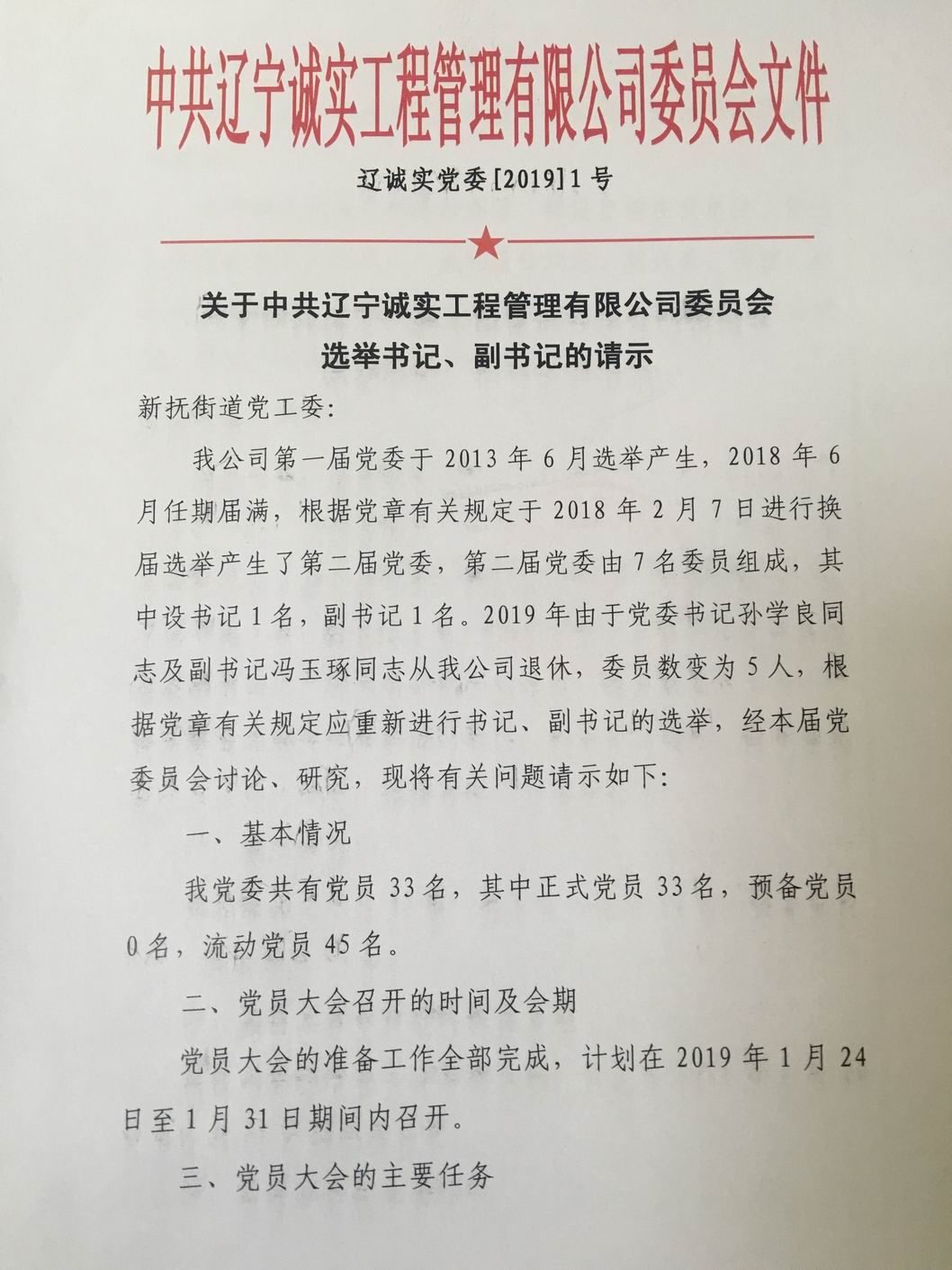 我公司第一屆黨委于2013年6月選舉產(chǎn)生,2018年6月任期屆滿,根據(jù)黨章有關(guān)規(guī)定于2018年2月7日進(jìn)行換屆選舉產(chǎn)生了第二屆黨委,第二屆黨委由7名委員組成,其中設(shè)書記1名,副書記1名。2019年由于黨委書記孫學(xué)良同志及副書記馮玉琢同志從我公司退休,委員數(shù)變?yōu)?人,根據(jù)黨章有關(guān)規(guī)定應(yīng)重新進(jìn)行書記、副書記的選舉。我公司于2019年1月10日申請換屆,并于2019年1月16日得到批復(fù)。