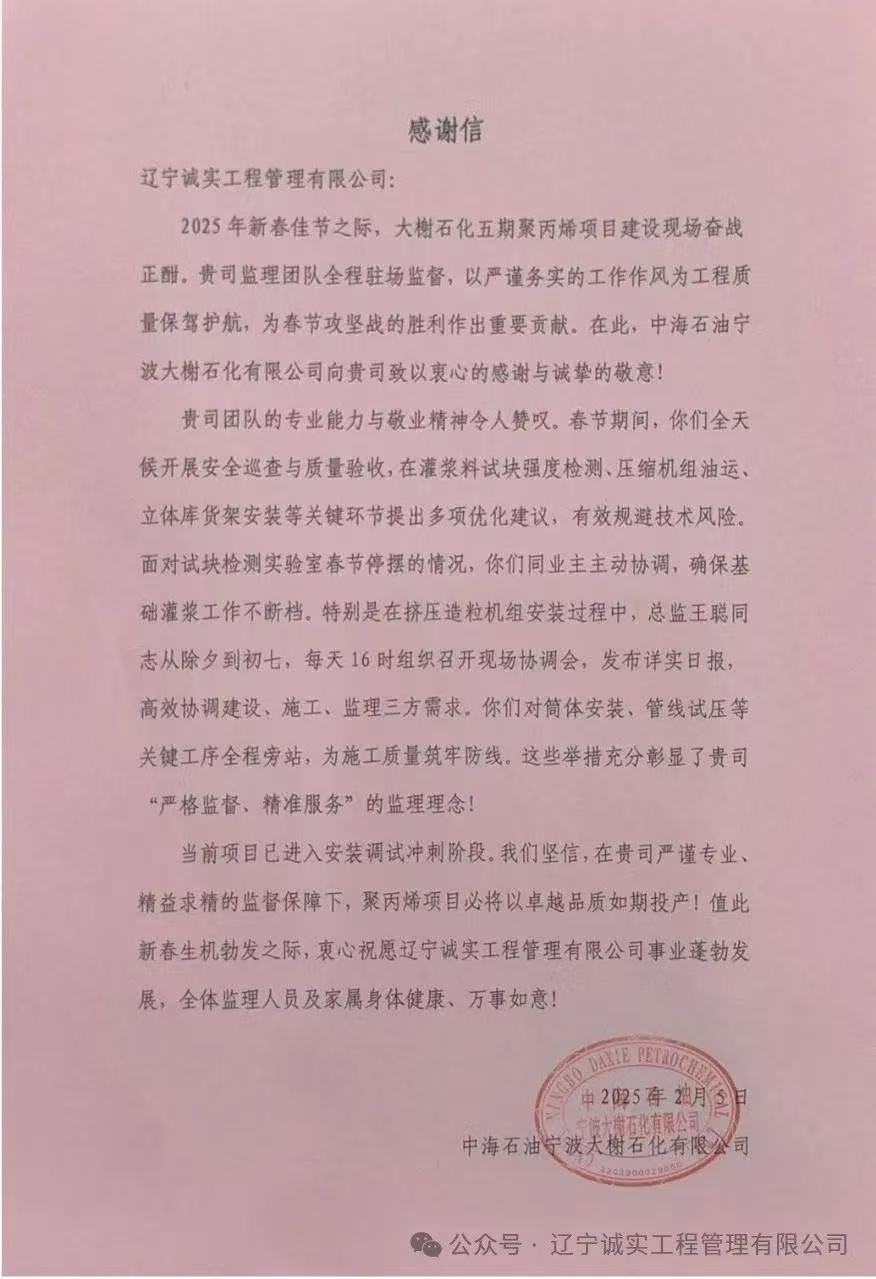 2025年2月5日,當(dāng)許多人仍沉浸在新春佳節(jié)的喜悅之中時(shí),中海油大榭石化五期聚丙烯項(xiàng)目監(jiān)理部以專業(yè)、奉獻(xiàn)的精神為項(xiàng)目安裝調(diào)試沖刺的關(guān)鍵過程保駕護(hù)航,并收獲到來自中海石油寧波大榭石化有限公司發(fā)來的一封感謝信。