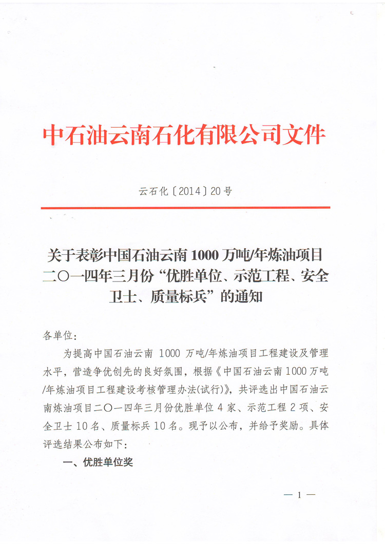 我公司榮獲中國(guó)石油云南1000萬噸/年煉油項(xiàng)目2014年3月份“優(yōu)勝單位”榮譽(yù)稱號(hào)!