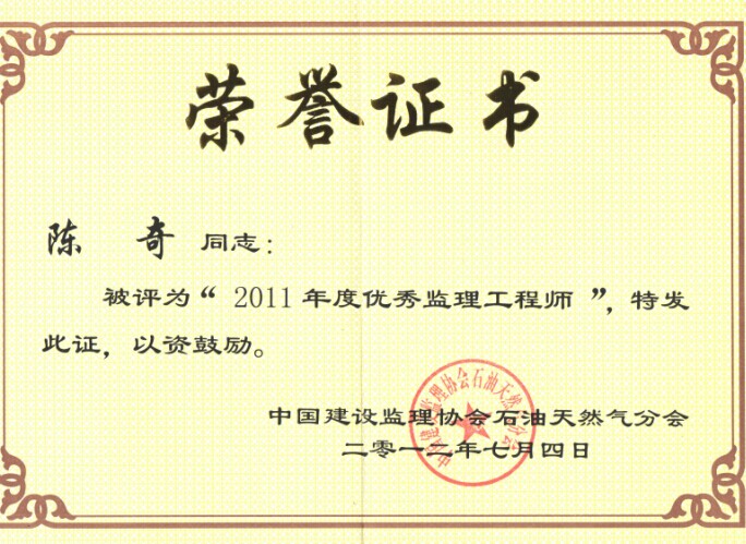 陳奇同志被中國(guó)建設(shè)監(jiān)理協(xié)會(huì)評(píng)為年度優(yōu)秀監(jiān)理工程師